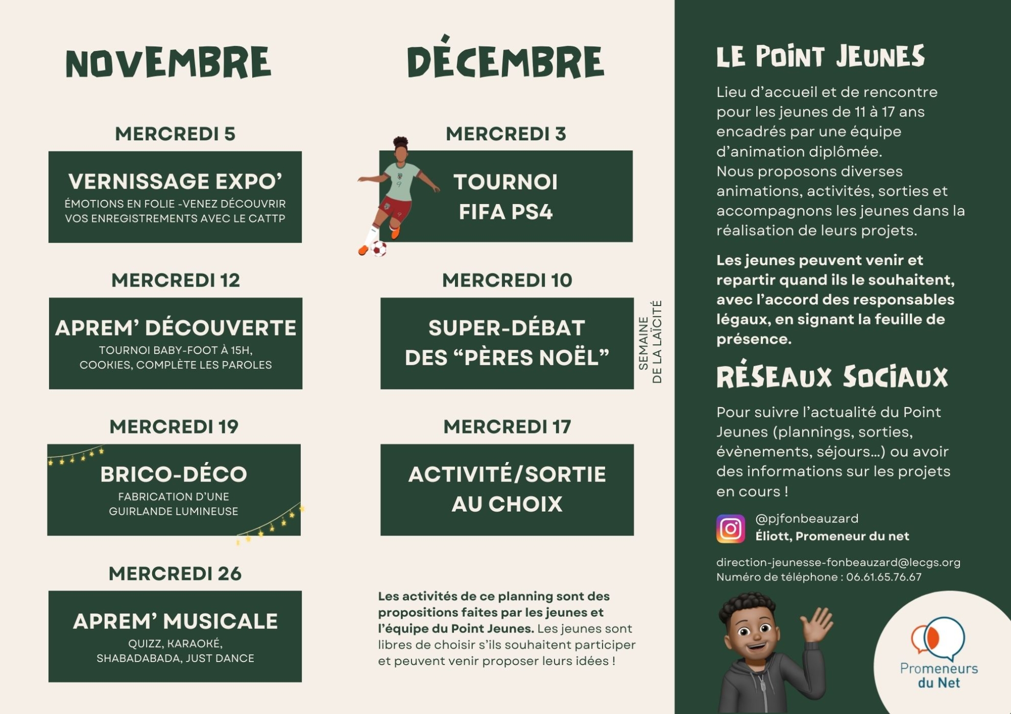 L’équipe d’animation (en concertation avec les jeunes) propose pour chaque période un planning d’activités. Ateliers sportifs, créations, bricolage, quizz, jeux d’ambiance, sorties,... L’équipe s’adapte aux besoins et envies des jeunes.