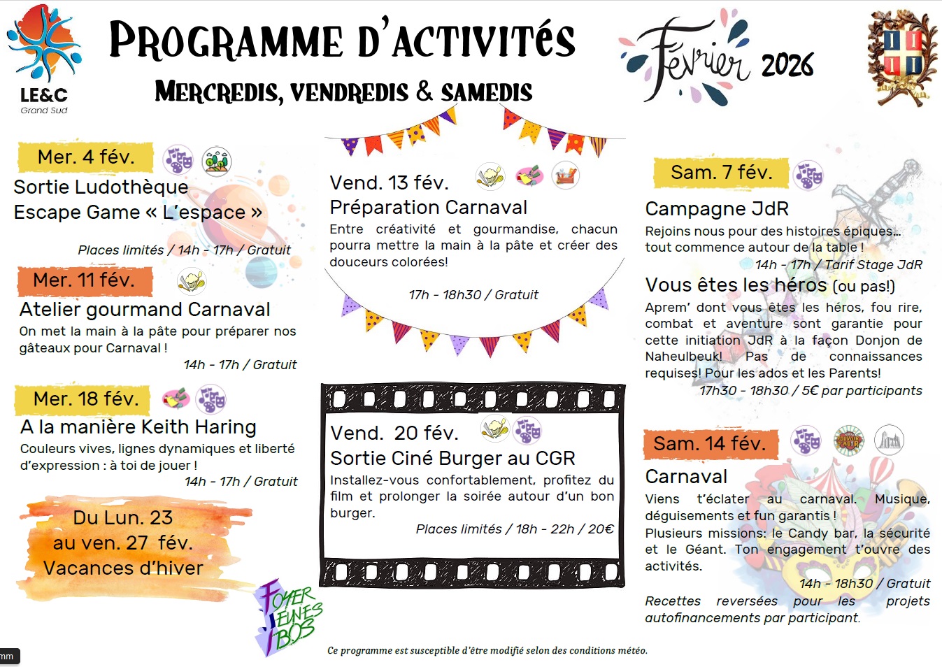 Programme des mercredis, vendredis et samedis