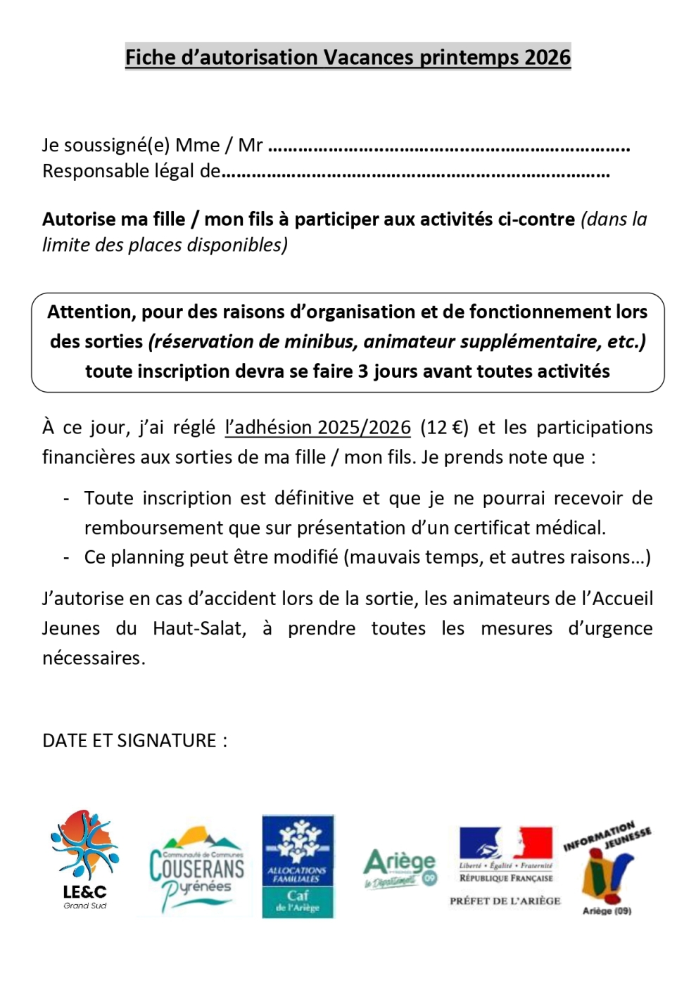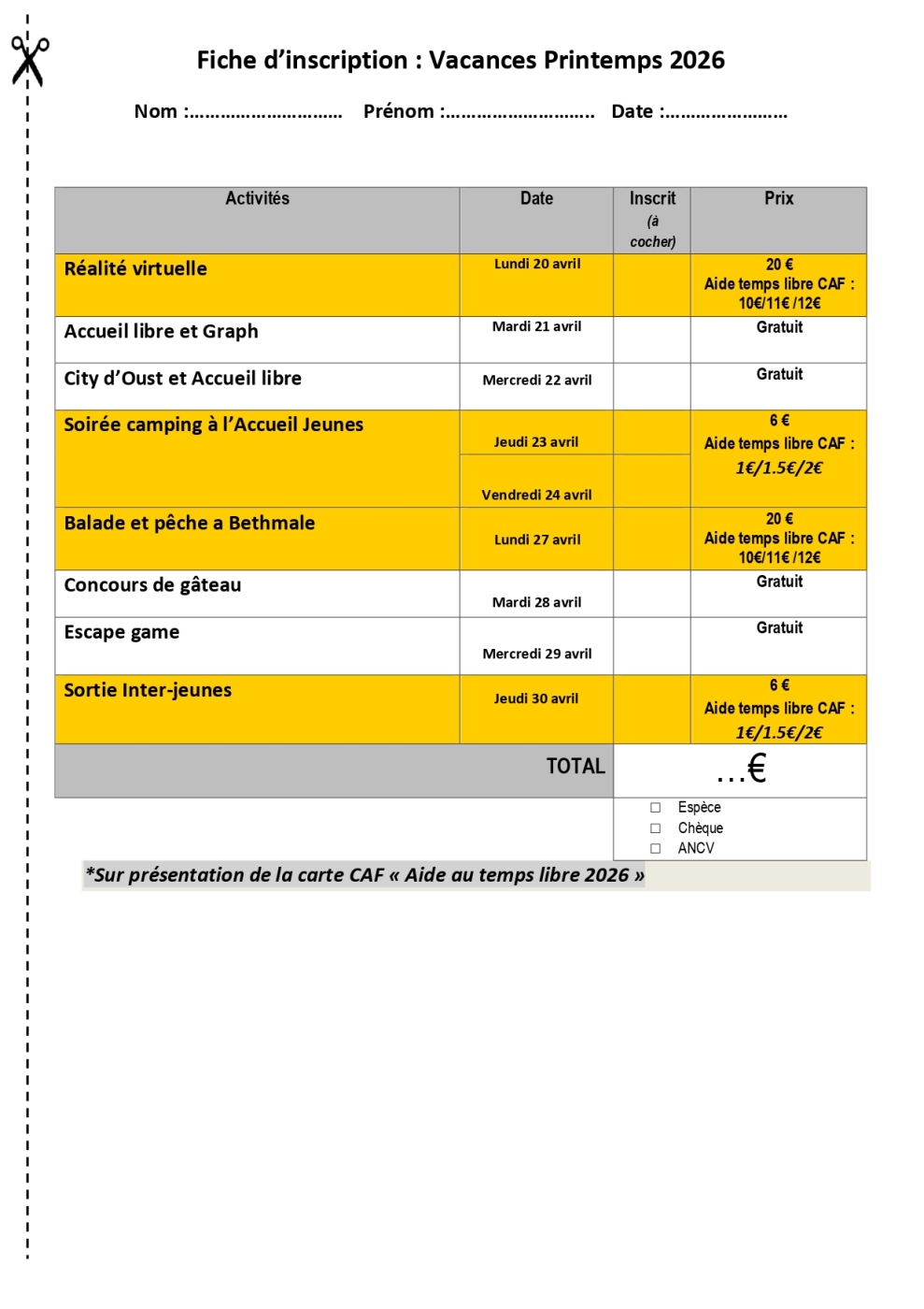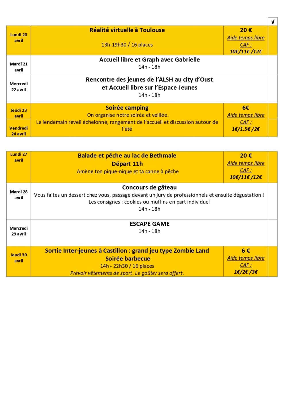 Vacances de Printemps du 20 au 30 avril 2026