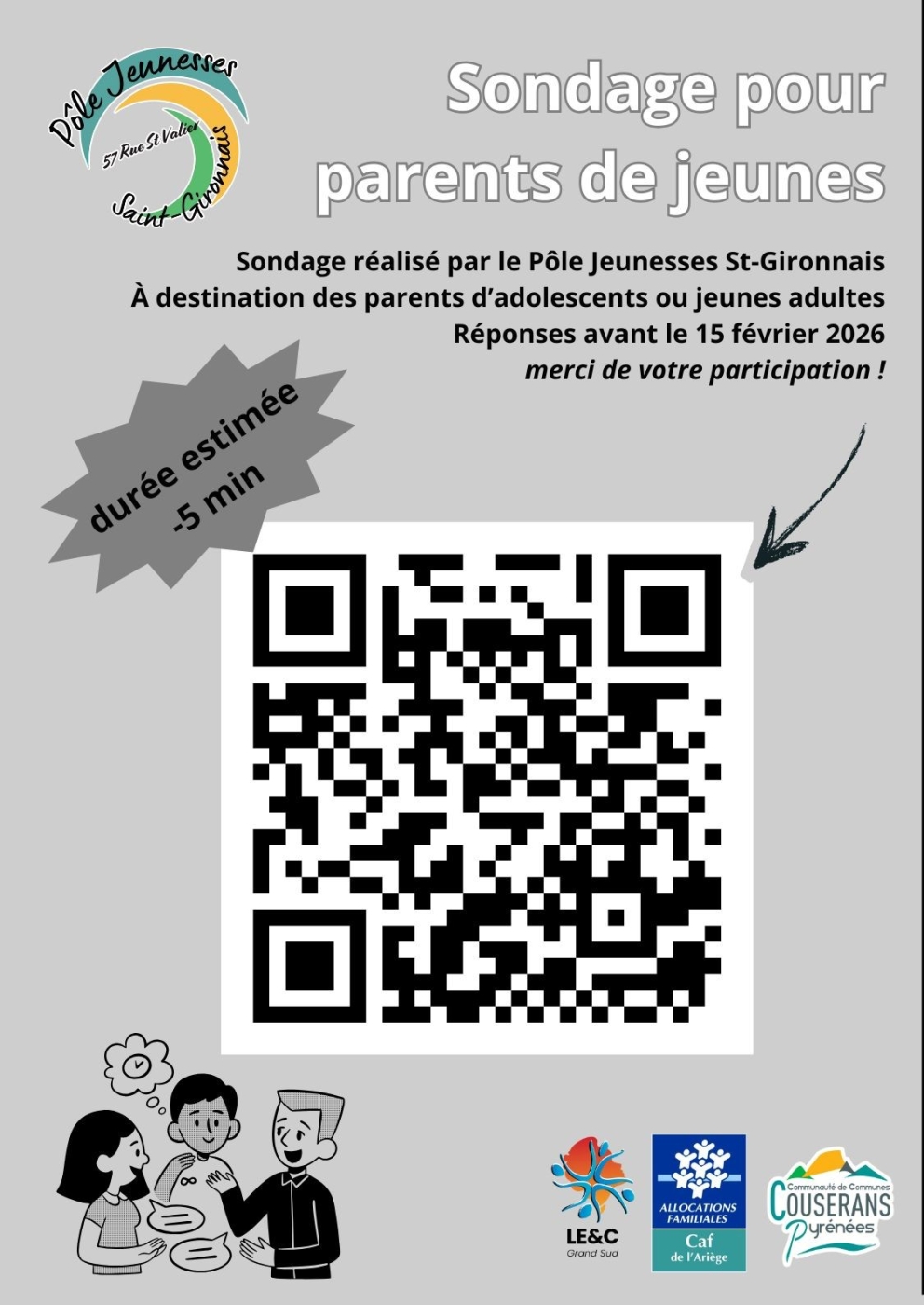 Dans le cadre de l’évaluation des actions « Parentalité » réalisées par le Pôle Jeunesses St-Gironnais, et du stage de 2ᵉ année de BTS SP3S réalisé actuellement par Haïda, n'hésitez à répondre au sondage suivant (destiné aux parents d'ados/jeunes)